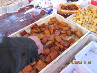 中国の家庭の食卓に欠かせない豆腐の漬物「腐乳」(fu三声 ru三声)です。豆腐に麹を漬け込み、塩水の中で発酵させたものですが、粥のお供や調味料として使われています。味は沖縄の豆腐ように似ている。