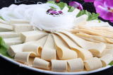 「豆腐皮」(dou四声 fu軽声 pi二声)~豆腐に圧力を加えて水をきり、紙のように薄く伸ばしたものである。結んだりしたら、「百葉結」(bai二声 ye四声 jie二声)になり、豆腐皮で豚の挽肉などを包んで、煮込んだ料理もある。豆腐皮を細切りにして塩やゴマ油などで味付けをしてできたのは、前菜やお酒のおつまみによく登場する「豆腐丝」(dou四声 fu軽声 si一声)である。
