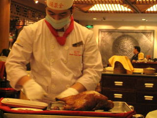 北京ダック専門店の中でも最も有名なのは「全聚徳」(quan二声 ju四声 de二声)だろう。北京ダックが北京観光のイメージ大使となる地位を位置づけた。「全聚徳」の創業者である楊全仁氏はもともと家禽類を営む商人であった。彼は集めた資金で「全聚徳」を開き、清朝の宮廷厨房で北京ダック担当をしていた料理人を招き、宮廷の「吊るし焼き」技術を用い、吊るし焼きタイプの北京ダックを民間に広めた。北京ダックには、吊るし焼きタイプと蒸し焼きタイプのものがある。明朝永楽期に創業した、蒸し焼きタイプの北京ダックで有名な「便宜坊」(pian二声 yi二声 fang一声)は、実は全聚徳よりも歴史があり、600年近くの歴史を有している。